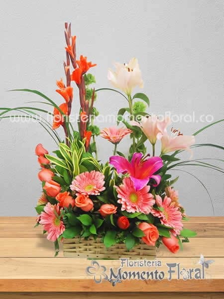 Lindo detalle elaborado en rosas salmón, lirios, gerveras, gladiolas y follajes.
