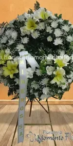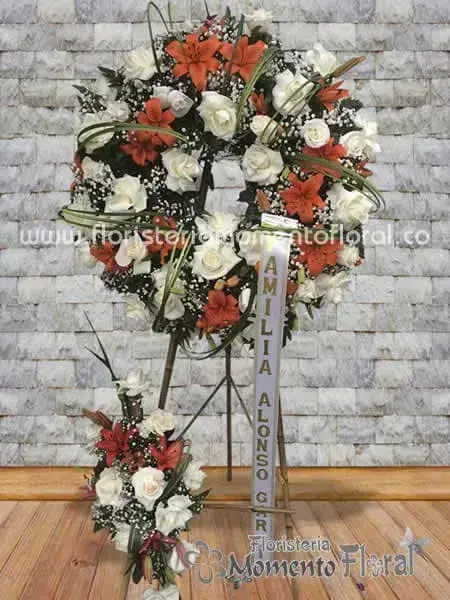 Pedestal Platino realizado con rosas blancas, lirios y un fino follaje verde.